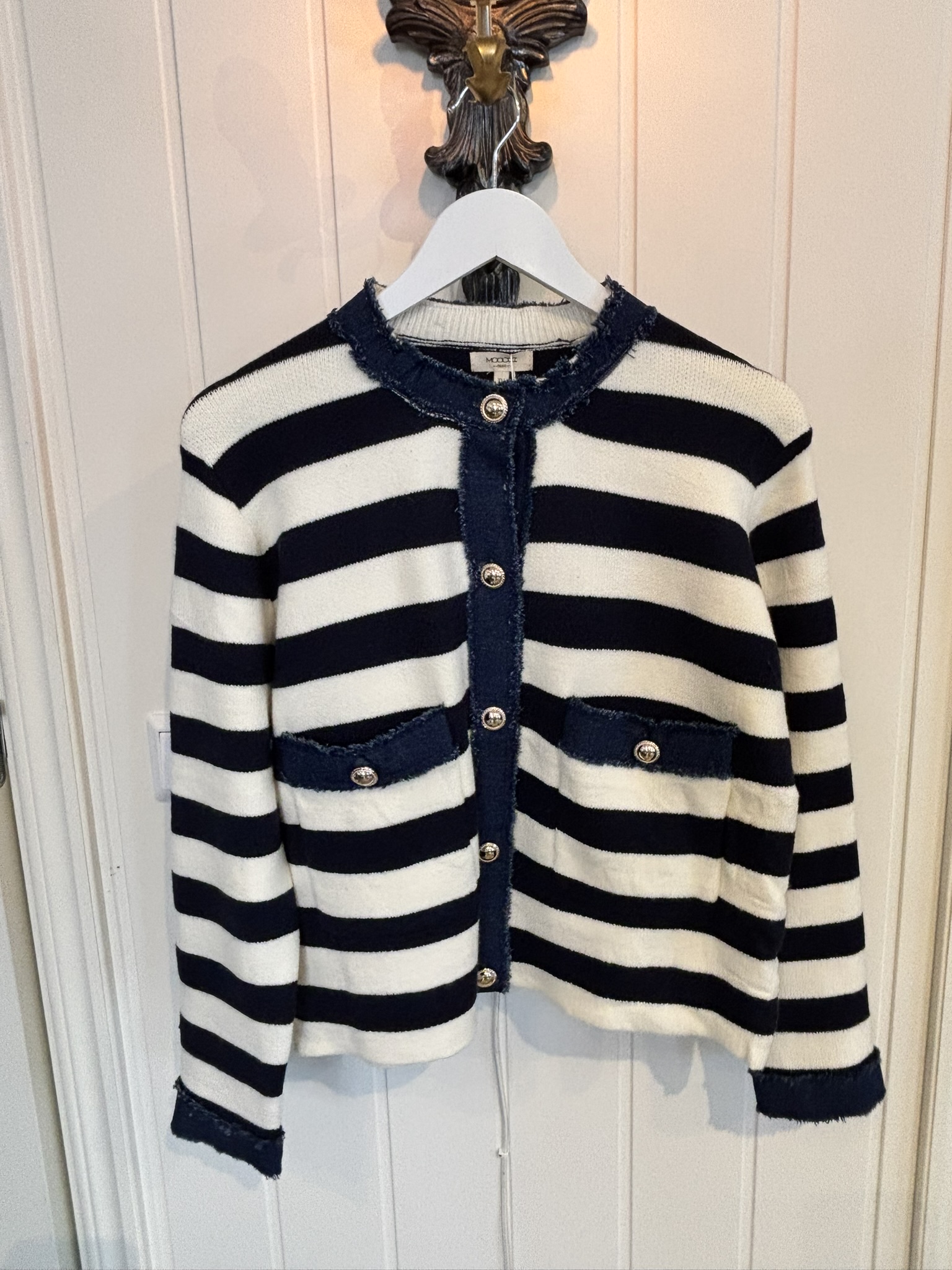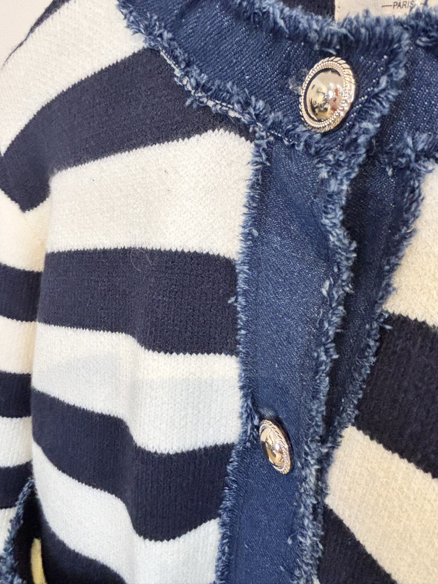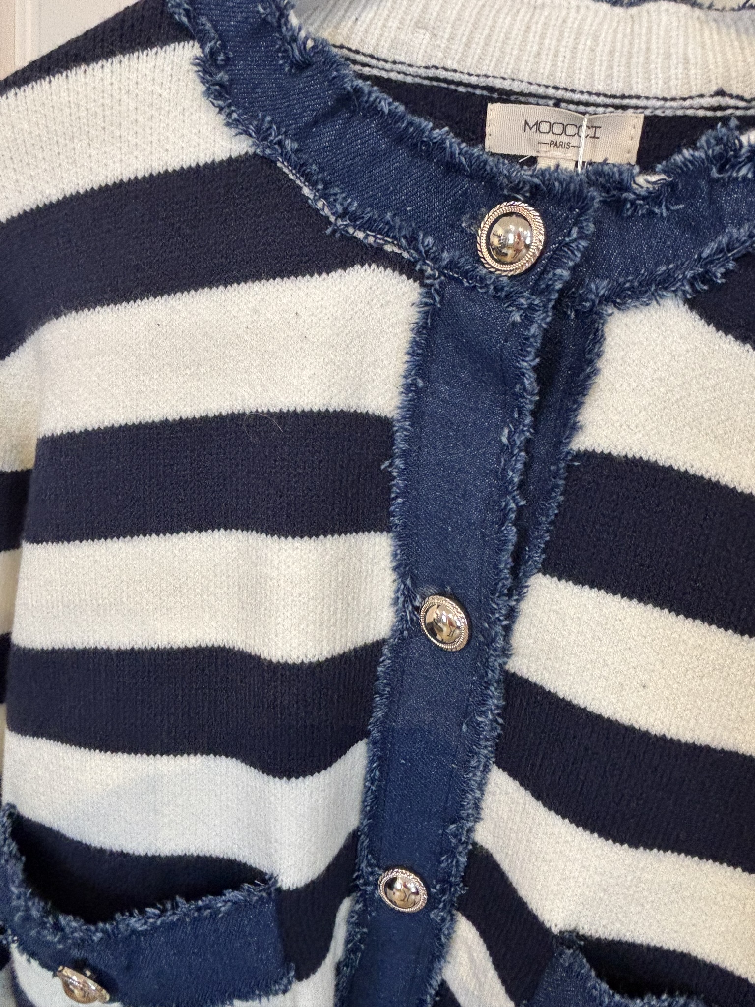Den klassiska blåvita randen möter jeansdetaljer och markerade knappar som ger ett sofistikerat uttryck.