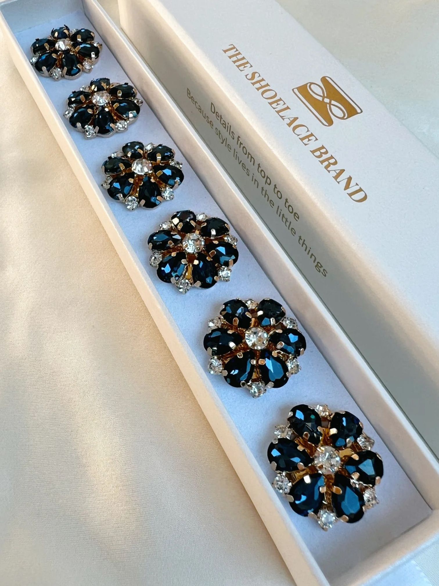 Isabelle är en blomformad knappcharm med guldfärgat underrede och djup marinblå samt vita kristallblad som skimrar som midnattshavet. Hon är döpt efter min kusin Bella – vi har vuxit upp sida vid sida, delat skratt, hemligheter och hela livet däremellan. Tidlös, trygg och alltid där. Precis som den här charmen.